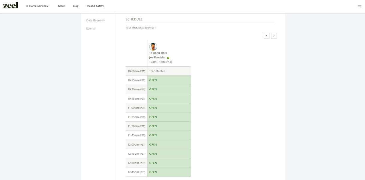 Log into your account at Zeel. Once logged in, you will see a confirmed event. If you have multiple events, you will need to toggle through event dates and/or locations.