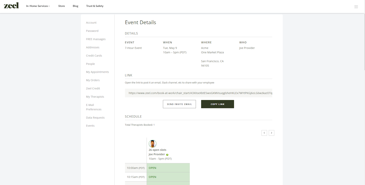 Log into your account at Zeel.com. Once logged in, you will see a confirmed event.