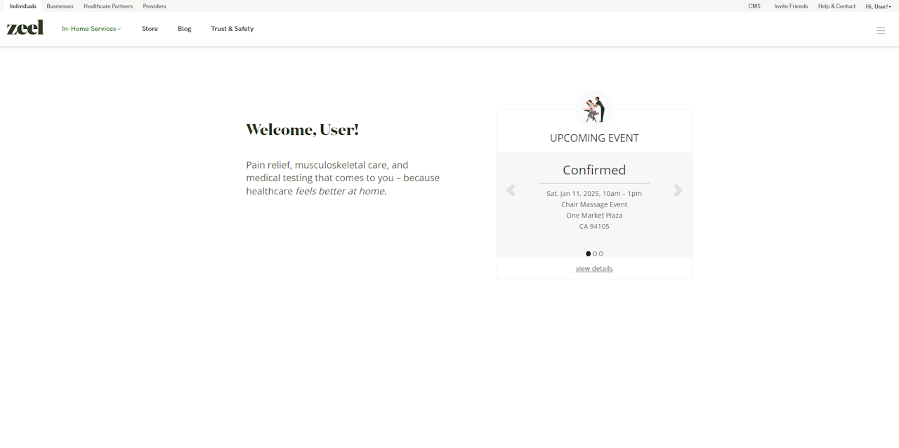 Log into your account at Zeel. Once logged in, you will see a confirmed event.